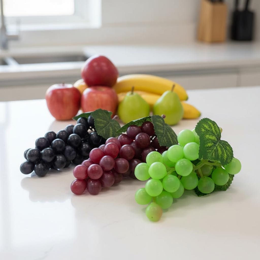 Zeleno grožđe izrađeno od plastike idealno je kao ukras za boce ili izložbene sobe. Dostupno i u drugim bojama.